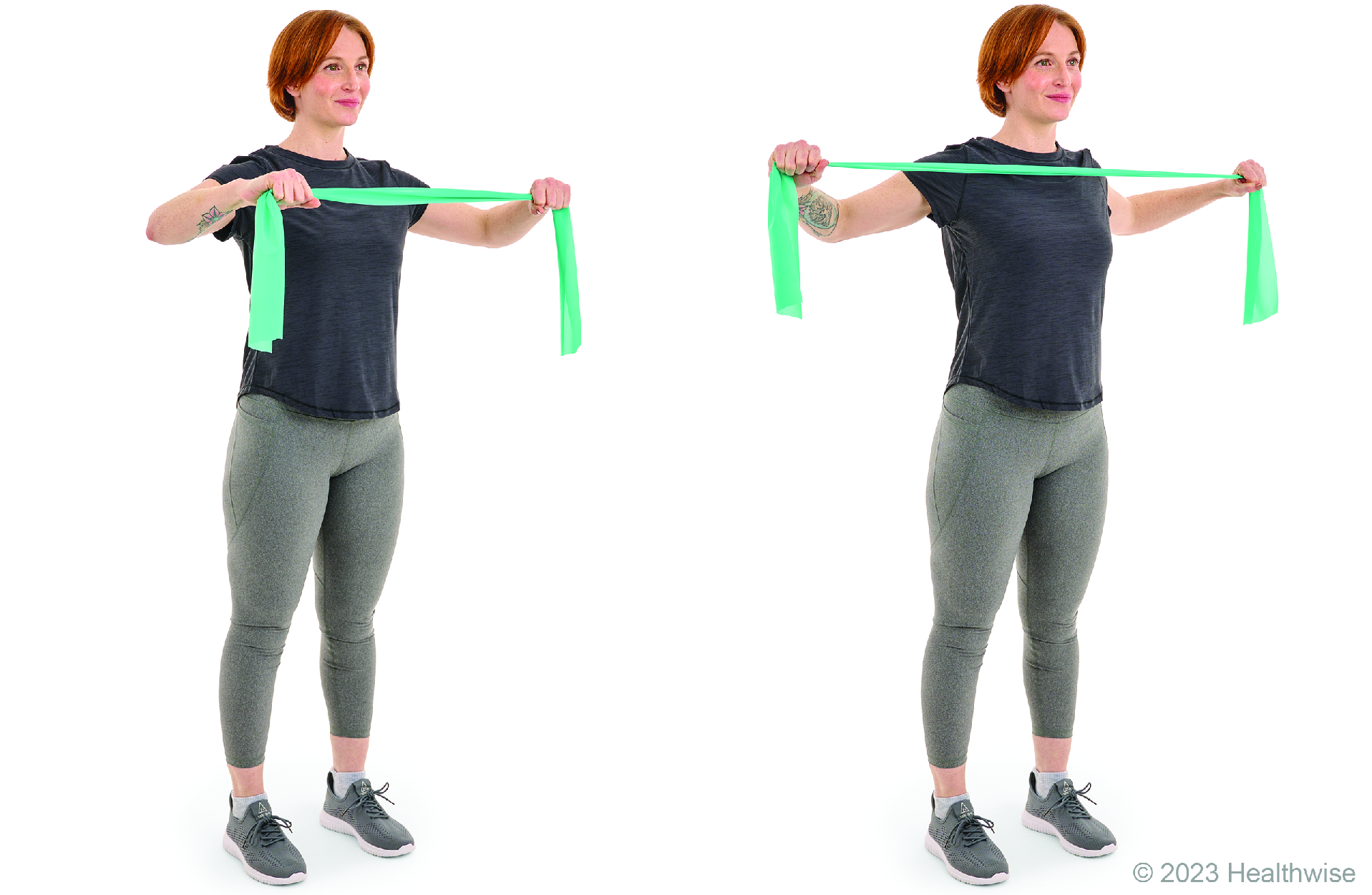 - Separe lentamente las manos y junte los omóplatos, estirando la banda. Mantenga la posición durante 1 o 2 segundos. Intente mantener las manos a la altura del pecho y no levante los hombros hacia las orejas.