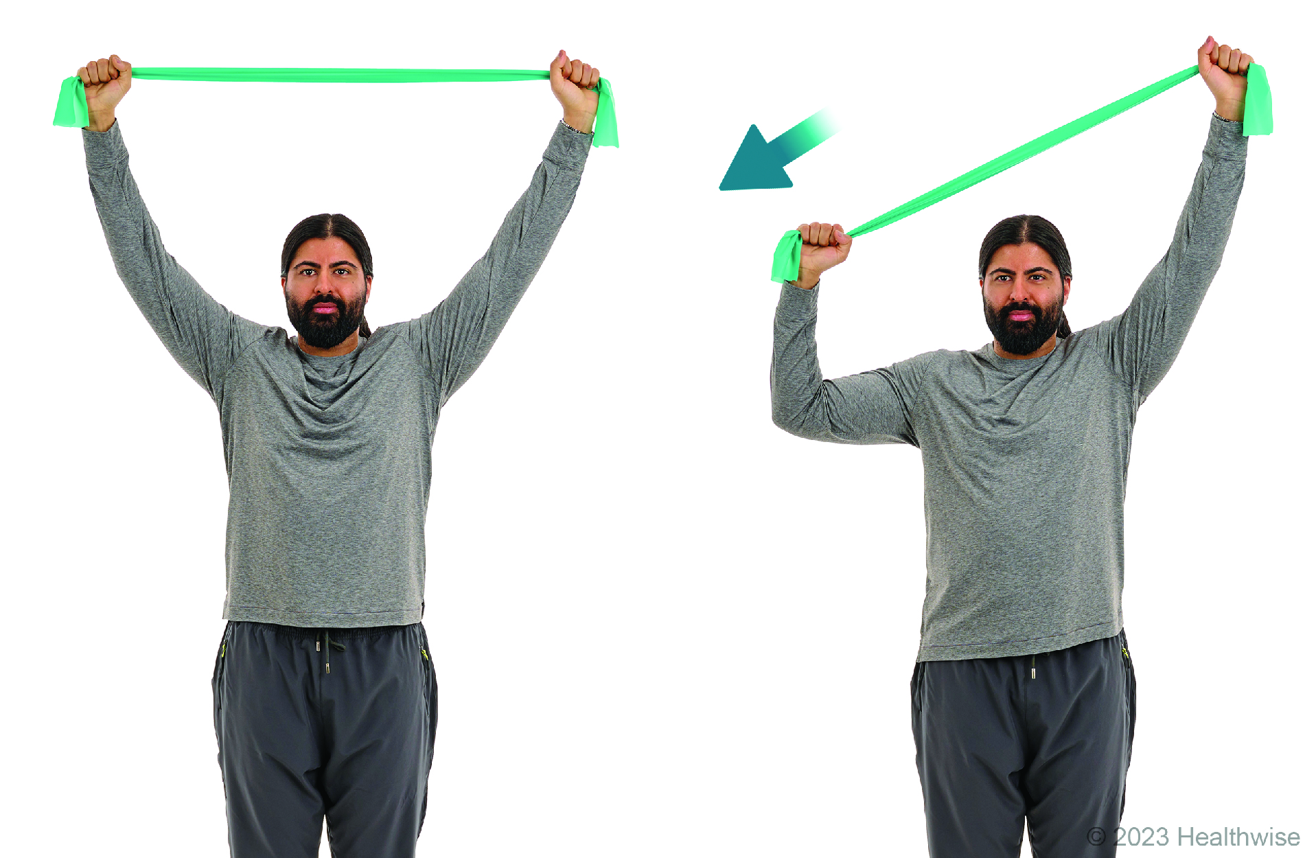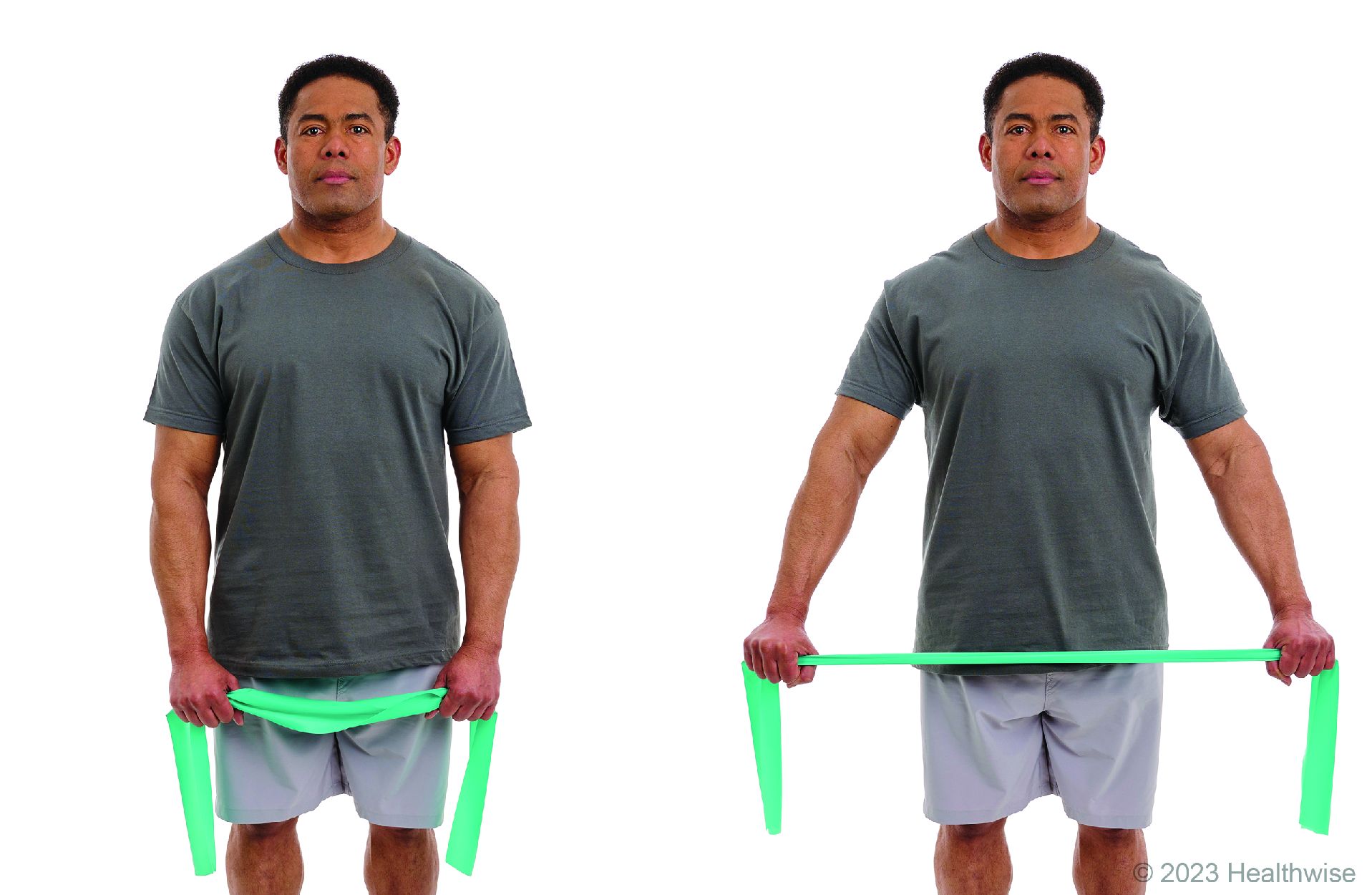 - Jale lentamente de un brazo hacia abajo y hacia un lado, doblando el codo y estirando la banda hasta que el codo quede a la altura del hombro. Mantenga la posición durante 1 o 2 segundos.