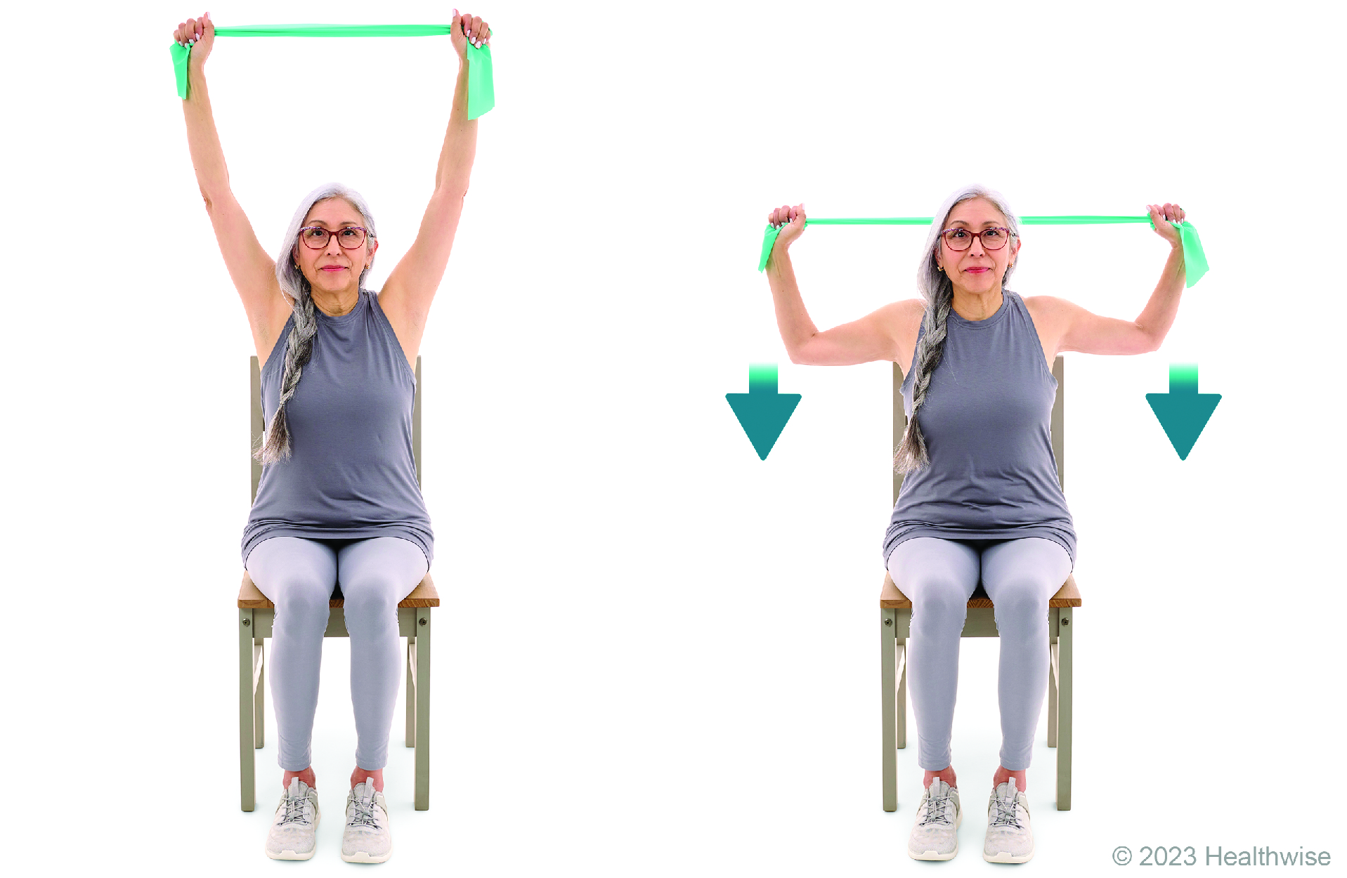 - Póngase de pie o siéntese derecho en una silla sin reposabrazos. Sujete una banda de resistencia con las manos separadas al ancho de los hombros.